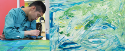 1993年生まれ。動物や飛行機など、様々な絵を描いてきた。現在はブランドのロゴにインスパイアされたかのような作品を描いている。その手法は多岐に渡り、時として斬新な画法を生み出す。最近では、石けんの泡で絵を包み込むという手法にこだわっている。いつも本能のまま生きている彼は、類まれなる身体能力を持ち、部屋の中でも外でも飛び跳ねていることが多い。そんなバイタリティを持っているからこそ、新しい発想ができるのかもしれない。